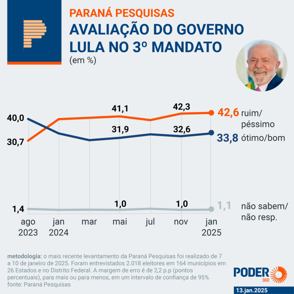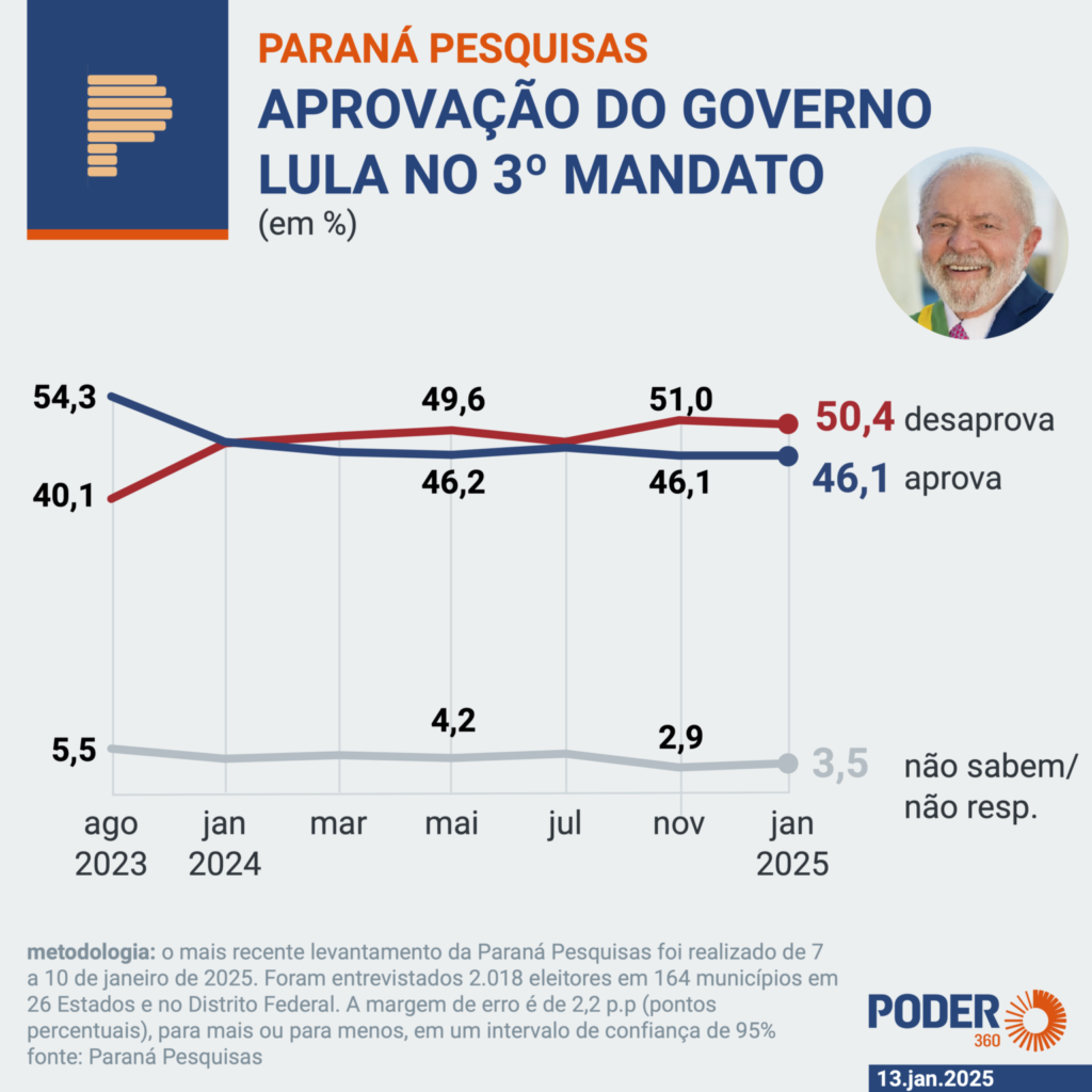 Levantamento Paraná Pesquisas divulgado nesta 2ª feira (13.jan.2025) mostra que 50,4% dos eleitores desaprovam o governo do presidente Luiz Inácio Lula da Silva (PT), enquanto 46,1% aprovam. A situação é de estabilidade desde novembro de 2024.