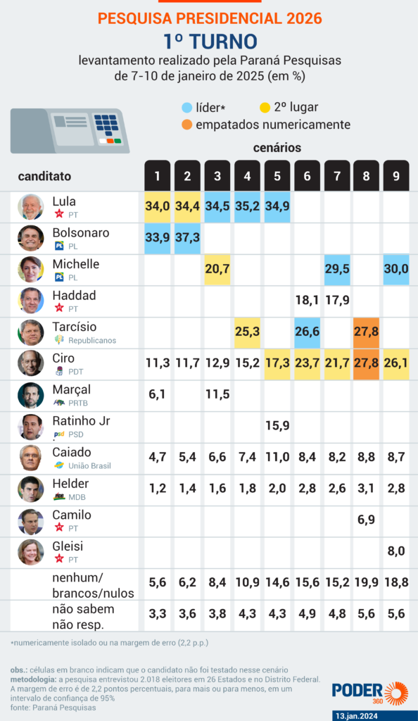 Outro levantamento da Paraná Pesquisas divulgado nesta 2ª feira (13.jan) indica que, se a eleição presidencial fosse hoje, Lula e o ex-presidente Jair Bolsonaro (PL), que está inelegível, estariam empatados.