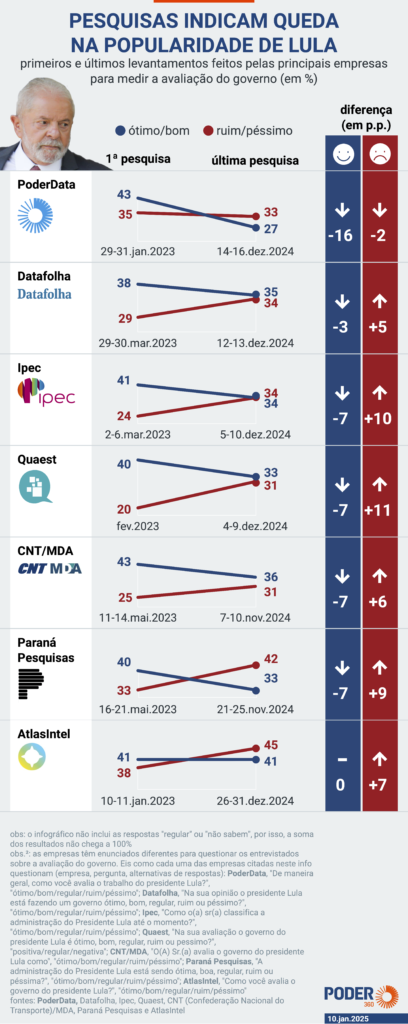 A pesquisa ouviu 2.018 pessoas com 16 anos ou mais em todo o Brasil de 7 a 10 de janeiro de 2025. O intervalo de confiança é de 95%. Já a margem de erro é de 2,2 p.p (pontos percentuais), para mais ou para menos. Eis a íntegra do estudo (PDF – 379 kB).