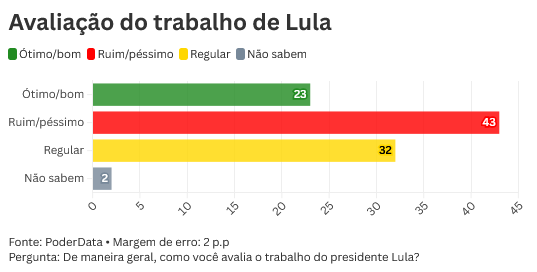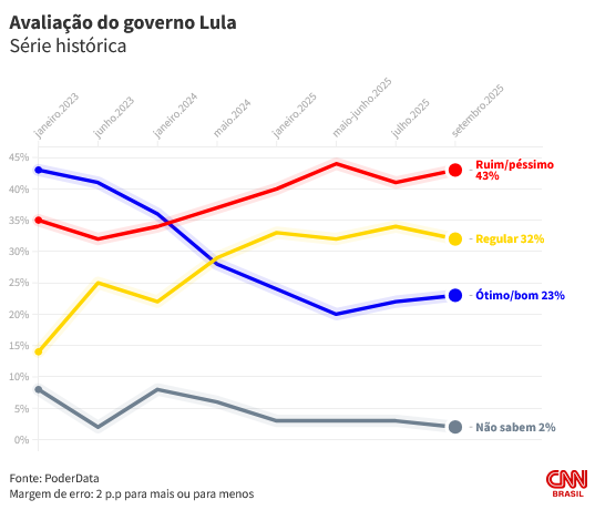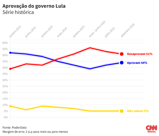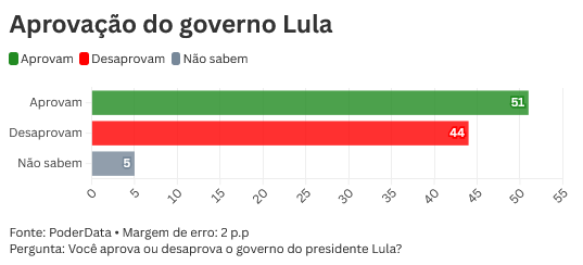 Pesquisa PoderData divulgada nesta quarta-feira (1°) aponta que 51% dos brasileiros desaprovam o governo do presidente Luiz Inácio Lula da Silva (PT). O percentual oscilou para baixo, dentro da margem de erro, comparado ao último levantamento, divulgado em julho, quando era de 53%.