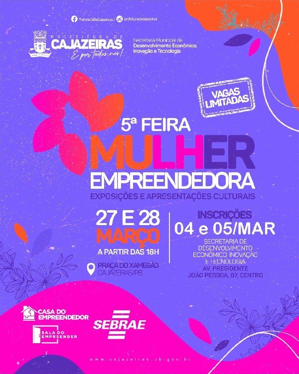 A 5ª Edição da Feira da Mulher Empreendedora de Cajazeiras já tem data marcada e promete reunir talento, criatividade e histórias inspiradoras. O evento será realizado nos dias 27 e 28 de março, a partir das 18h, no Xamegão, e chega como um importante espaço para fortalecer o comércio local, incentivar novos negócios e ampliar oportunidades para as mulheres empreendedoras do município.