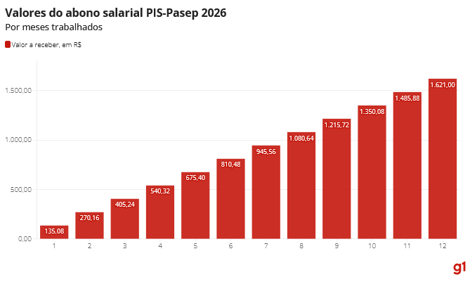 Com o aumento do salário mínimo, o valor do abono salarial passará a variar de R$ 135,08 a R$ 1.621, de acordo com a quantidade de meses trabalhados. Veja no gráfico abaixo: