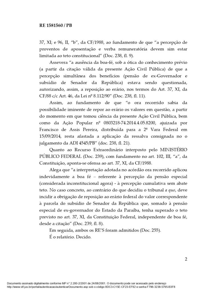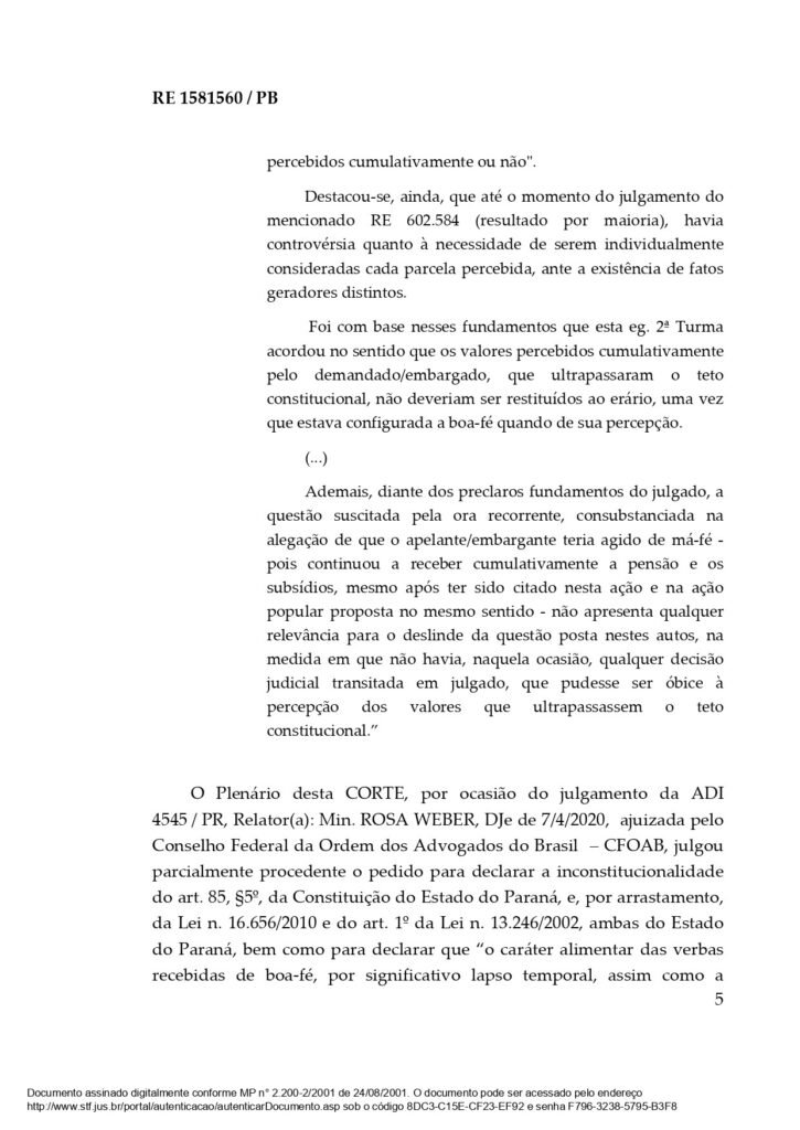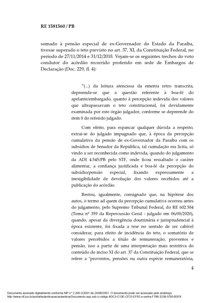 Alexandre de Moraes considerou, em sua decisão, que o acórdão que estava sendo contestado está em consonância com a jurisprudência do STF, devendo ser mantido. A decisão destaca que “o Tribunal de origem, amparando-se na boa-fé da parte ora recorrida, julgou improcedente o pedido de devolução do valor correspondente à parcela do subsídio de Senador da República que, somado à pensão especial de ex-Governador do Estado da Paraíba, tivesse superado o teto previsto no art. 37, XI, da Constituição Federal, no período de 27/11/2014 e 31/12/2018”.