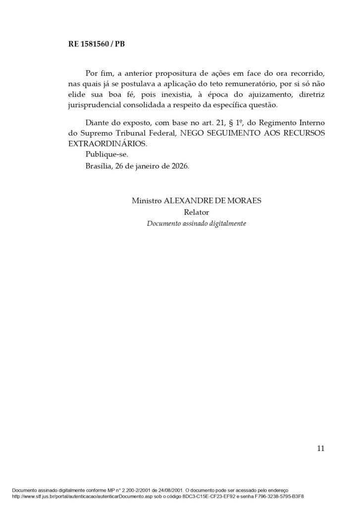 “A anterior propositura de ações em face do ora recorrido, nas quais já se postulava a aplicação do teto remuneratório, por si só não elide sua boa fé, pois inexistia, à época do ajuizamento, diretriz jurisprudencial consolidada a respeito da específica questão”, destacou Alexandre de Moraes em sua decisão.