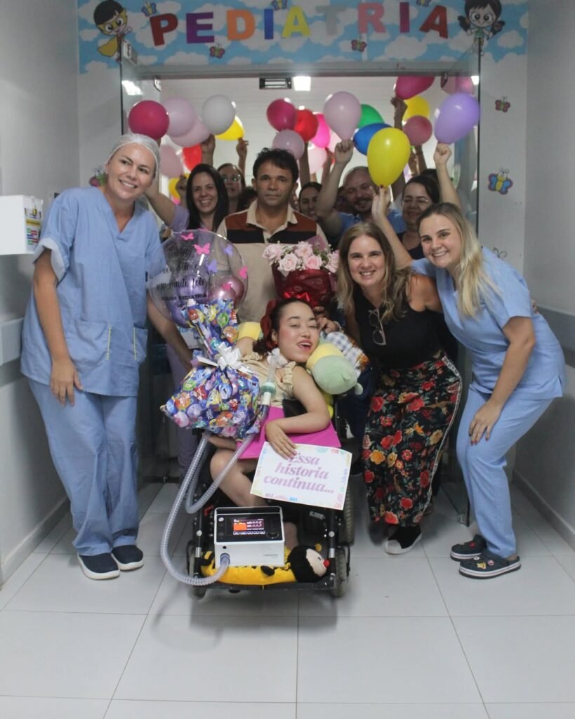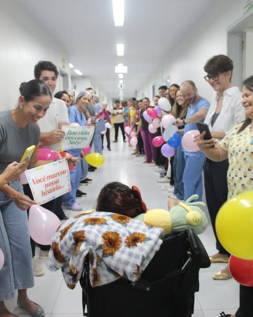 Em imagens compartilhadas pelo HU, é possível ver equipe multiprofissional com bolas coloridas e cartazes com frases de carinho, como “Você marcou a nossa história”, “Boa vida em casa, Naty” e “Um novo capítulo começa hoje”.