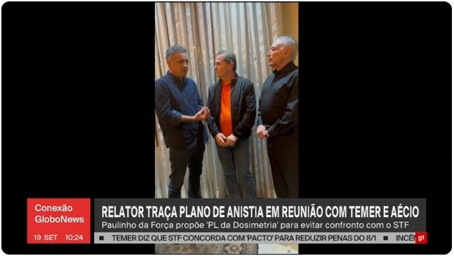 Estavam presentes no encontro, além de Temer, o relator do projeto, Paulinho da Força (Solidariedade-SP), e o deputado Aécio Neves (PSDB-MG). O presidente da Câmara dos Deputados, Hugo Motta (Republicanos-PB), e os ministros Alexandre de Moraes e Gilmar Mendes, do Supremo Tribunal Federal (STF), participaram de forma remota.
