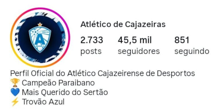 O Atlético de Cajazeiras consolidou sua presença digital ao figurar na sétima colocação entre os clubes da primeira divisão do Campeonato Paraibano com maior número de seguidores no Instagram. O levantamento, realizado pelo perfil Paraíbas FC, aponta que o “Trovão Azul do Sertão” conta atualmente com uma base de 45,5 mil seguidores. O dado reforça a força da torcida cajazeirense no ambiente virtual, colocando o clube à frente de tradicionais adversários regionais como o Confiança de Sapé e o Pombal.