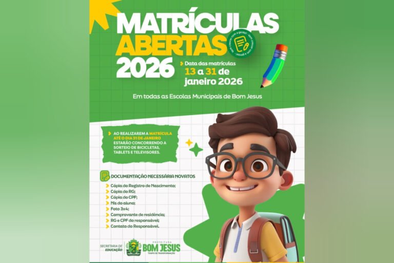 A Prefeitura anuncia que estão abertas as matrículas para o ano letivo de 2026 em todas as escolas municipais, com vagas para Educação Infantil, Ensino Fundamental I e II, AEE e EJA. Os alunos matriculados até o dia 31 de janeiro concorrerão a sorteios de bicicletas, tablets e televisores.