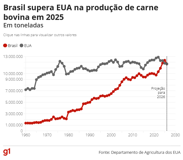 O USDA também compartilhou as projeções para 2026, e apontou que o volume de carne bovina o Brasil deverá diminuir em relação a 2025, equalizando a produção do país com a dos EUA.