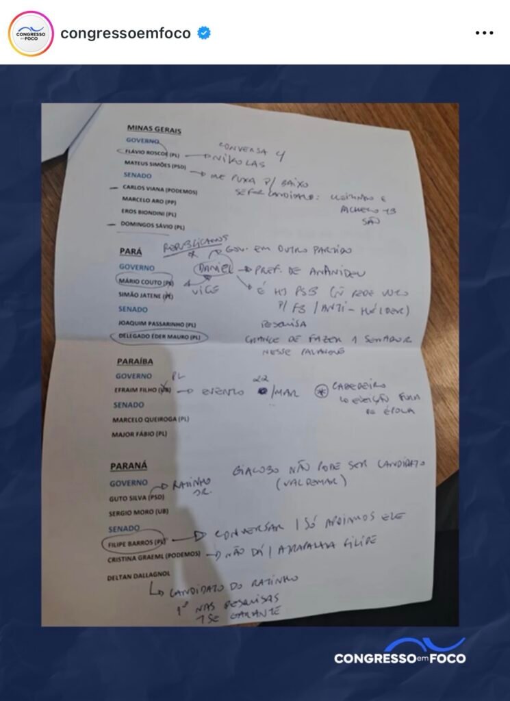 Ainda segundo as anotações, o PL planeja lançar dois nomes próprios para o Senado na Paraíba: o ex-ministro da Saúde Marcelo Queiroga e Major Fábio. Já as definições sobre vice-governador e outras alianças na chapa majoritária seguem em aberto.
