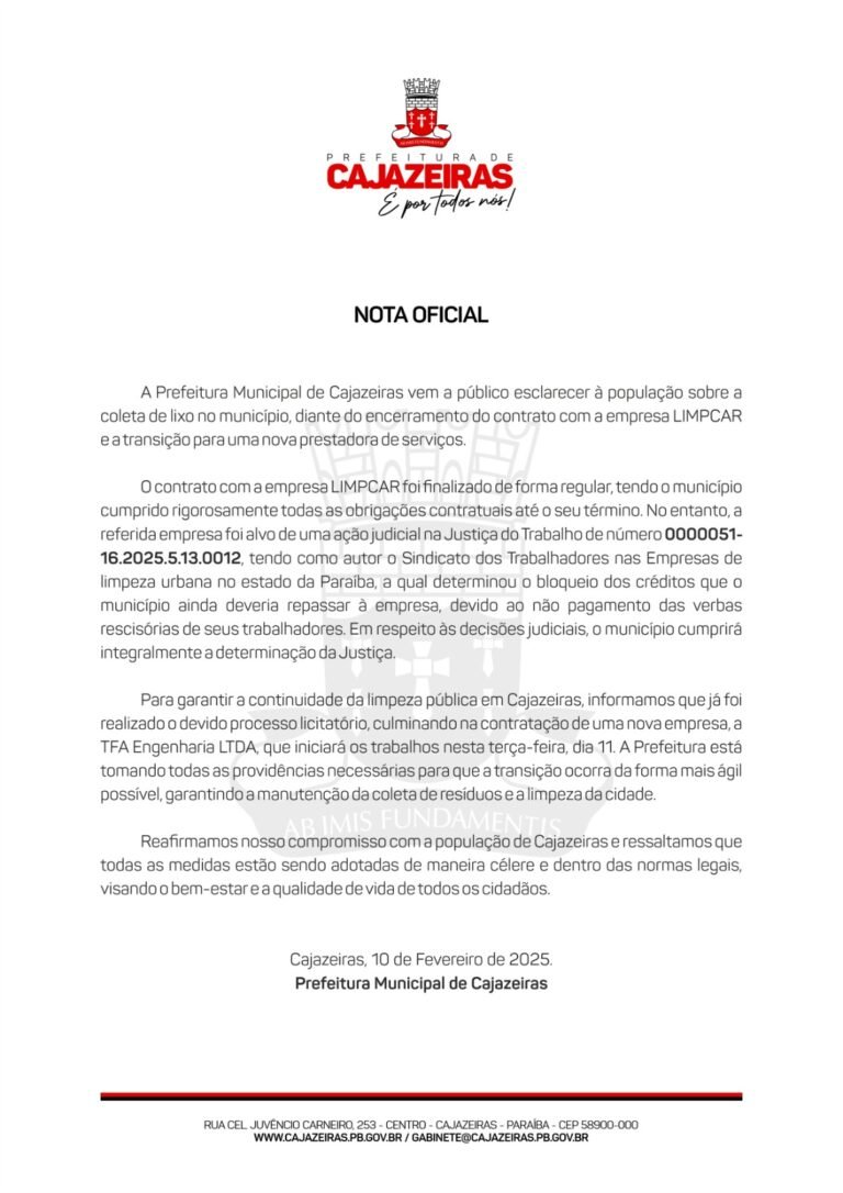 Segundo nota oficial, a LIMPCAR teve seu contrato finalizado regularmente, com a administração municipal cumprindo todas as obrigações contratuais até o fim do vínculo. No entanto, uma ação movida pelo Sindicato dos Trabalhadores nas Empresas de Limpeza Urbana do Estado da Paraíba resultou no bloqueio dos valores que a prefeitura ainda devia à empresa, devido ao não pagamento de verbas rescisórias dos funcionários. O impasse jurídico teria contribuído para a precarização do serviço nos últimos dias.