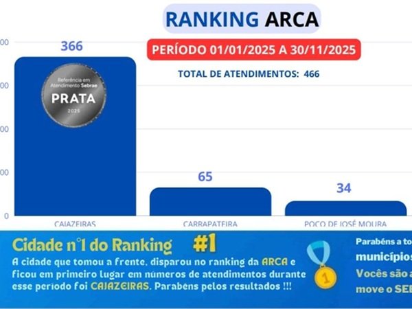 O município de Cajazeiras alcançou o primeiro lugar em número de atendimentos realizados por meio do Sistema Foco do Sebrae, no âmbito da Agência Regional de Cajazeiras (ARCA), no período de 1º de janeiro a 30 de novembro de 2025. O resultado coloca Cajazeiras na liderança entre os 15 municípios que integram a região metropolitana atendida pela agência regional.