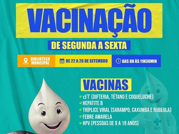 “Vacinar é proteger.” Com este lema, a Prefeitura de Cajazeiras, por meio da Secretaria Municipal de Saúde, inicia mais uma importante campanha de imunização, que acontecerá entre os dias 22 e 26 de setembro, sempre no turno da manhã, das 8h às 11h30, na Biblioteca Pública Municipal.