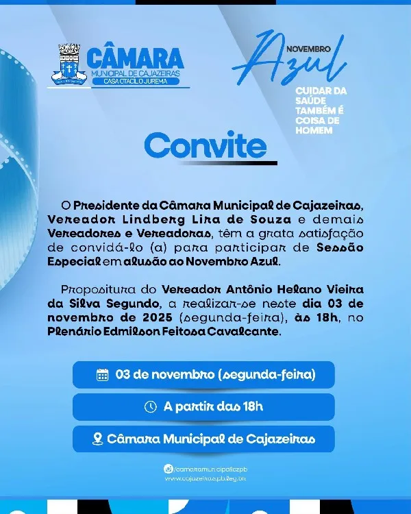 O Presidente da Câmara Municipal de Cajazeiras, vereador Lindberg Lira de Souza e demais vereadores e vereadoras, convida toda a população de Cajazeiras para participar de Sessão Especial em alusão ao Novembro Azul.