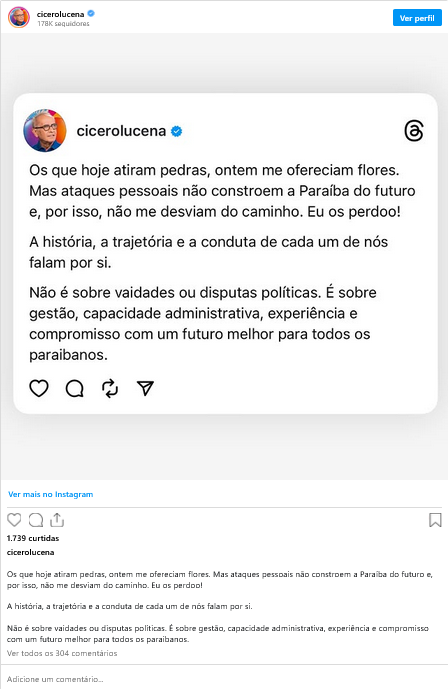 “Os que hoje atiram pedras, ontem me ofereciam flores. Mas ataques pessoais não constroem a Paraíba do futuro e, por isso, não me desviam do caminho. Eu os perdoo!”, iniciou a postagem Cícero.