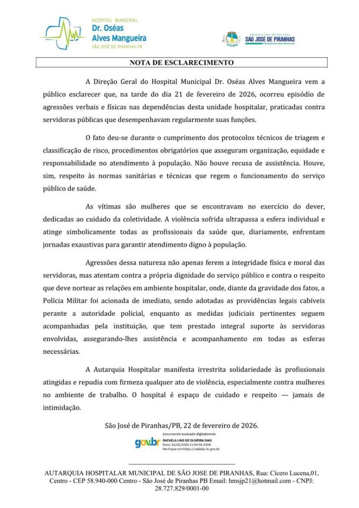 Uma tarde que deveria ser de cuidado e atendimento médico terminou em tumulto e medo no Hospital Municipal Dr. Oséias Alves Mangueira, em São José de Piranhas, no Sertão paraibano. Um homem foi detido pela polícia após se exaltar durante um atendimento, agredir funcionárias e causar confusão dentro da unidade de saúde, no último sábado (21).