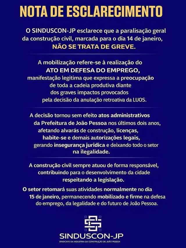 O Sindicato da Indústria da Construção Civil da Capital (Sinduscon-JP) emitiu uma nota de esclarecimento para retificar informações sobre a mobilização do setor. A entidade enfatizou que a paralisação agendada para a próxima quarta-feira (14) não se trata de uma greve, mas sim de um “Ato em Defesa do Emprego“.