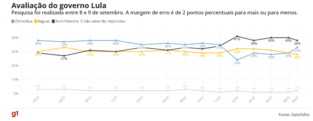 Uma pesquisa Datafolha divulgada nesta quinta-feira (11) pelo jornal “Folha de S.Paulo” aponta que 33% dos brasileiros consideram o governo Lula ótimo ou bom e 38%, ruim ou péssimo.
