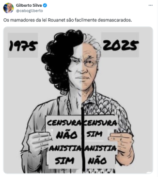 Na postagem, Cabo Gilberto compartilhou uma montagem com duas imagens de Caetano: uma de 1975, quando o artista defendia a anistia política durante a ditadura militar, e outra de 2025, quando se manifestou contra a anistia aos envolvidos nos atos golpistas.