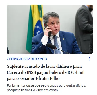 Reportagem do Estadão, nesta segunda-feira (23), revelou que o senador Efraim Filho (agora no PL) teve um boleto de cerca de R$ 51 mil quitado por seu segundo suplente, Erik Janson Marinho, que é investigado por suspeita de envolvimento em lavagem de dinheiro ligada a desvios no Instituto Nacional do Seguro Social.