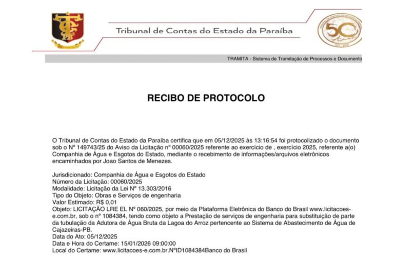 A Companhia de Água e Esgotos da Paraíba (Cagepa) publicou aviso de licitação para a execução de uma obra voltada ao sistema de abastecimento de água de Cajazeiras. O certame está marcado para o dia 15 de janeiro de 2026 e será realizado por meio da plataforma eletrônica do Banco do Brasil.