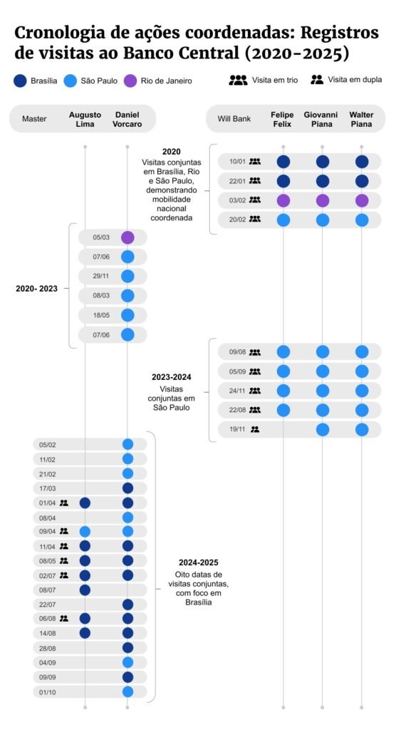 Desde 2024, houve uma transição que pode ser considerada estratégica: as reuniões na sede, em Brasília, se tornaram mais frequentes, em detrimento da unidade em São Paulo – a alta cúpula do BC costuma despachar na capital federal. Foi assim com a dupla Vorcaro-Guga.
