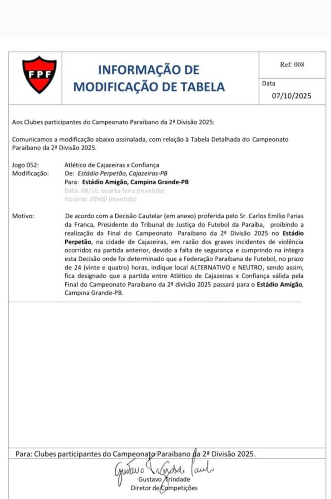 O comunicado é assinado por Gustavo Trindade, diretor de competições da FPF, e foi direcionado a todos os clubes participantes do Campeonato Paraibano da 2ª Divisão 2025.