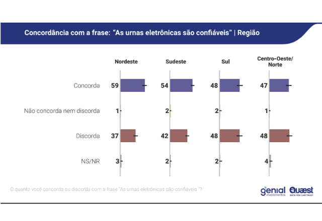 Os dados indicam diferenças regionais. No Sul e no Centro-Oeste, há empate técnico entre os que confiam e os que não confiam nas urnas. No Nordeste, 59% afirmam confiar, enquanto 37% dizem não confiar. Já no Sudeste, 54% declaram confiança no sistema, contra 42% que demonstram desconfiança.