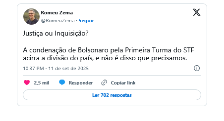 Entre os governadores de direita com intenção de disputar o Planalto no ano que vem, Romeu Zema (Novo), de Minas Gerais, disse em um post no X que a condenação do ex-presidente “acirra a divisão do país, e não é disso que precisamos”. “Justiça ou inquisição?”, questionou na publicação.