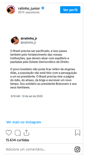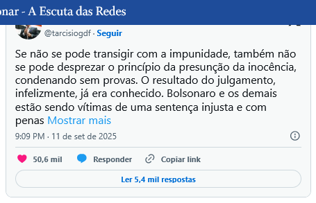 Na legenda, Jorginho escreveu que o processo foi baseado em “uma denúncia sem provas” e que o ex-presidente foi “um réu condenado antes mesmo do seu julgamento”. O governador do Rio de Janeiro, Cláudio Castro (PL), por sua vez, disse que a decisão da Primeira Turma “acirra tensões políticas nacionais e aprofunda a divisão entre os brasileiros”. “Queridos Flavio Bolsonaro, Eduardo, Michele, Renan, Carlos e Laura, se vocês choram por um pai, o Brasil chora pelo nosso presidente”, acrescentou.