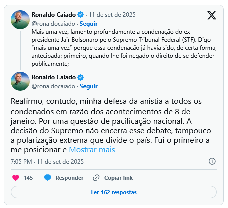 Ronaldo Caiado (União Brasil), de Goiás, por sua vez, reafirmou a “defesa da anistia” aos envolvidos no 8/1 por uma questão de “pacificação nacional”. “A decisão do Supremo não encerra esse debate, tampouco a polarização extrema que divide o país. Fui o primeiro a me posicionar e reitero: se tiver a oportunidade de chegar à Presidência da República, assinarei a anistia assim que tomar posse”, disse em nota.