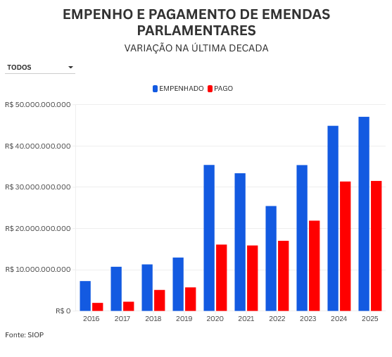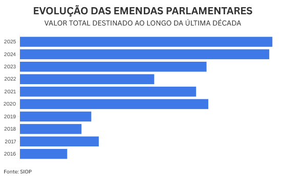 Em uma década, o valor total destinado a emendas parlamentares do Congresso Nacional aumentou 5x, saltando de R$ 9 bilhões em 2016 para R$ 48,5 bilhões em 2025.