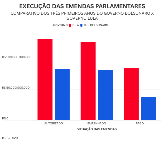 Já nos três primeiros anos do terceiro governo do presidente Lula, foram R$ 132 bilhões autorizados para o Congresso indicar e R$ 127 bilhões empenhados (96%), ou seja, confirmados pelo governo que seria pagos.