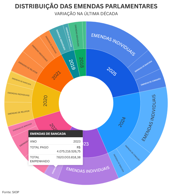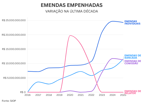 No comparativo, o principal aumento vem das emendas de comissões, que eram pouco utilizadas durante o governo Bolsonaro e após o encerramento das emendas do orçamento secreto passaram a ser mais utilizadas, em função da dificuldade em se identificar os verdadeiros autores das emendas. Em 2020 o governo do ex-presidente empenhou R$ 497 milhões. Já em 2025 foram R$ 11,2 bilhões.
