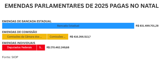 Na semana do Natal, o governo do presidente Luiz Inácio Lula da Silva pagou R$ 1,53 bilhão em emendas parlamentares. Desse valor, 55% foram para emendas das bancadas estaduais, que são impositivas. O montante somou R$ 831 milhões.