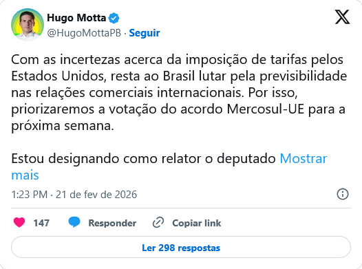 “Com as incertezas acerca da imposição de tarifas pelos Estados Unidos, resta ao Brasil lutar pela previsibilidade nas relações comerciais internacionais. Por isso, priorizaremos a votação do acordo Mercosul-UE na próxima semana”, afirmou Hugo em publicação no X. “Estou designando como relator o deputado Marcos Pereira (Republicanos-SP), que foi ministro da Indústria, Comércio Exterior e Serviços e também participou da construção desse tratado tão aguardado por 26 anos”, completou.