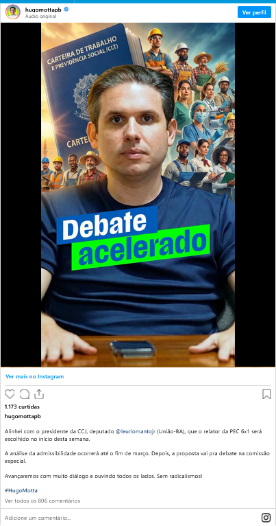 PEC 6 X 1 – Por meio de suas redes sociais Hugo afirmou que também avançara nesta semana a PEC (proposta de emenda à Constituição) da escala 6×1 na CCJ (Comissão de Constituição e Justiça e de Cidadania) onde será indicado o relator no início desta semana. “Alinhei com o presidente da CCJ, deputado @leurlomantojr (União-BA), que o relator da PEC 6×1 será escolhido no início desta semana. A análise da admissibilidade ocorrerá até o fim de março. Depois, a proposta vai pra debate na comissão especial. Avançaremos com muito diálogo e ouvindo todos os lados. Sem radicalismos”, disse Motta por meio das suas redes sociais.