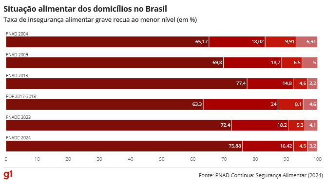 Proporcionalmente, a parcela de domicílios nessa condição caiu de 27,6% para 24,2%, mostrando que quase um em cada quatro lares ainda vive com insegurança alimentar. Em contrapartida, a proporção de domicílios em segurança alimentar aumentou de 72,4% para 75,8%.