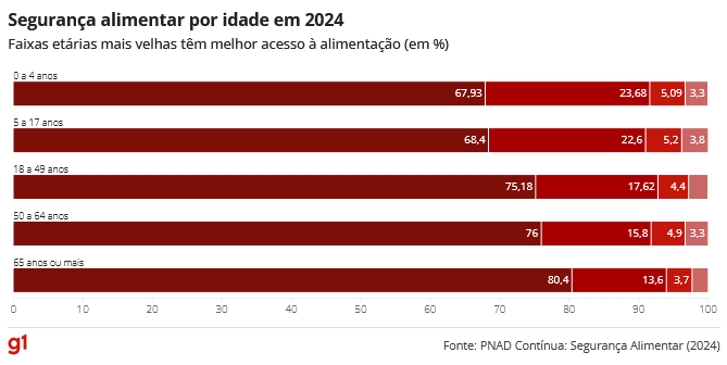A insegurança alimentar grave atingiu mais crianças e adolescentes: 3,3% da população de 0 a 4 anos e 3,8% dos 5 a 17 anos, contra 2,3% entre pessoas com 65 anos ou mais.