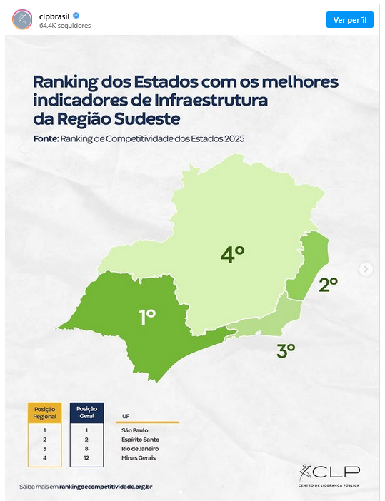 O Ranking de Competitividade dos Estados 2025, elaborado pelo Centro de Liderança Pública (CLP), apontou que a Paraíba é o segundo estado do Nordeste e o sétimo do Brasil com melhores indicadores de Infraestrutura. Na Região, a Paraíba só fica atrás do estado de Sergipe.