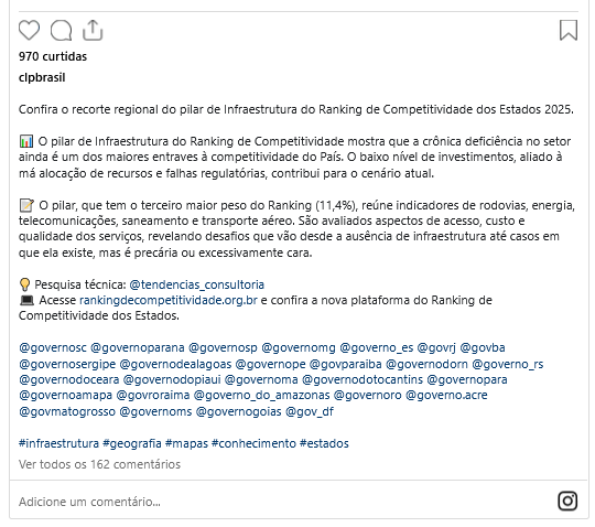 O pilar, que tem o terceiro maior peso do Ranking (11,4%), reúne indicadores de rodovias, energia, telecomunicações, saneamento e transporte aéreo. São avaliados ainda aspectos de acesso, custo e qualidade dos serviços, revelando desafios que vão desde a ausência de infraestrutura até casos em que ela existe, mas é precária ou excessivamente cara.