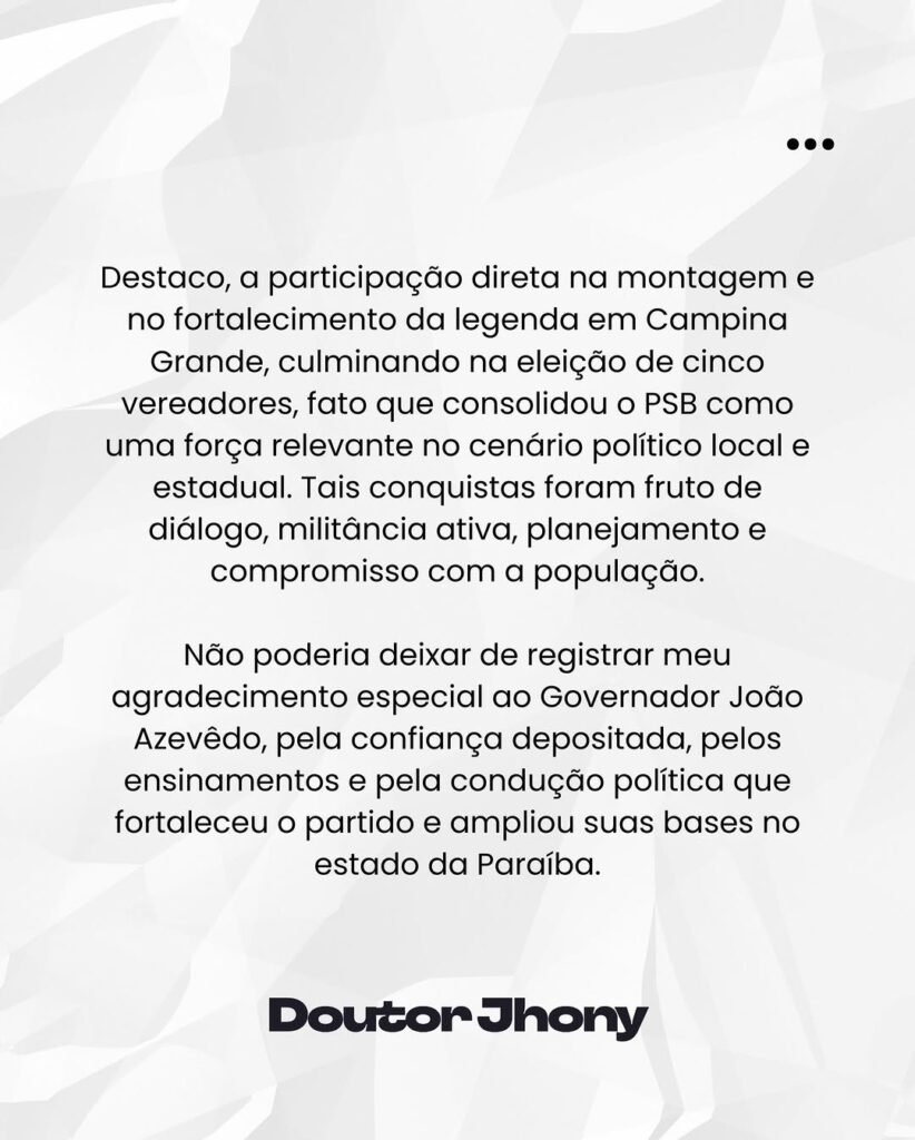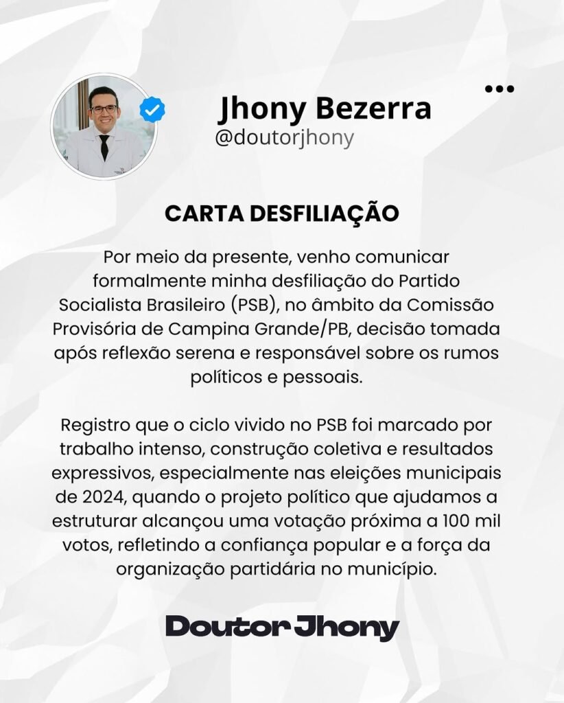 A oficialização ocorre um dia após Jhony Bezerra formalizar sua desfiliação do PSB. Em publicação feita nas redes sociais também nesta quarta-feira, o médico divulgou a carta de desligamento encaminhada ao governador João Azevêdo, presidente estadual da sigla, entregue na terça-feira (27). No documento, Jhony faz um balanço positivo do período em que esteve no partido.