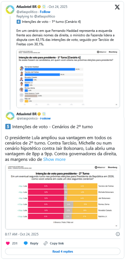 A Atlas Intel ouviu 14.063 eleitores entre os dias 15 e 19 de outubro. A margem de erro é de 1 ponto percentual para mais ou para menos.