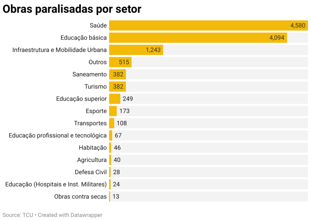 O levantamento do TCU também mostra o cenário em relação às obras paralisadas por setor. Os empreendimentos voltados para a área da saúde são os que mais se destacam, com um total de 4.580. Já em relação aos relacionados à Educação Básica, o número de obras paralisadas chega a 4.094. Em seguida está o setor de Infraestrutura e Mobilidade Urbana, com 1.243 empreendimentos paralisados.