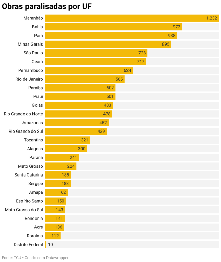 Entre as unidades da federação, o Maranhão conta com a maior quantidade de obras públicas paralisadas, com um total de 1.232, o que corresponde a 76,8% do total no estado. Na sequência aparece a Bahia, com 972 empreendimentos nessa condição, ou seja, 69,6% do total. Em terceiro lugar do ranking está o Pará, com 938 obras paradas – 65,5% do total.