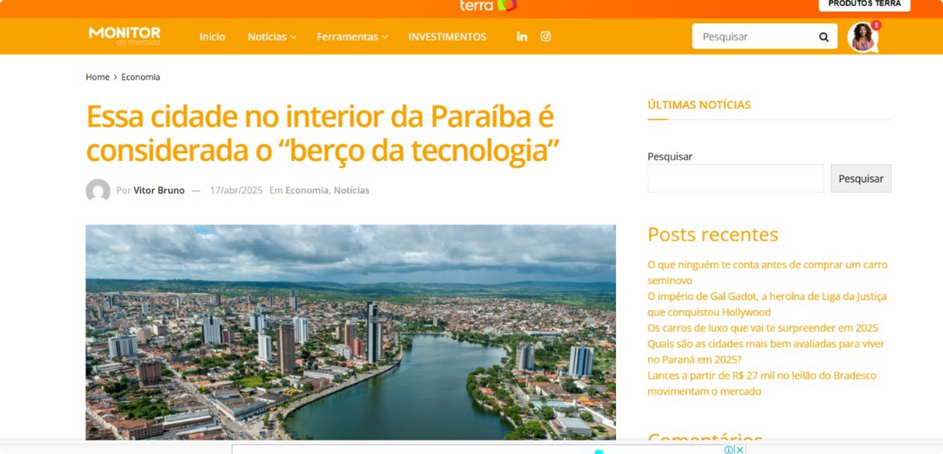 Com o título “Essa cidade no interior da Paraíba é considerada o berço da tecnologia”, a matéria publicada no último dia 17 de abril, cita vários aspectos da cidade como atrativos para investidores. “Campina Grande, cidade localizada no agreste da Paraíba, é uma das mais importantes do Nordeste brasileiro. Conhecida como o ‘berço da tecnologia’, e por sediar o ‘Maior São João do Mundo’, o Município alia tradição, inovação e qualidade de vida, sendo referência em educação, cultura e desenvolvimento econômico”, afirma o texto publicado.
