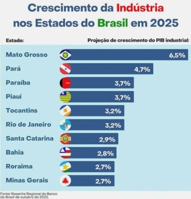 No ranking nacional, os estados com maior crescimento industrial são Mato Grosso (6,5%), Pará (4,7%), Paraíba (3,7%), Piauí (3,7%) e Tocantins (3,2%), enquanto os piores desempenhos ficam com Rio Grande do Norte e Pernambuco, ambos com -1,4%. O avanço coloca a Paraíba em posição de destaque no Nordeste e evidencia o fortalecimento do setor produtivo local.