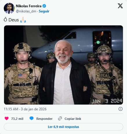 Em sua conta no “X”, Nikolas Ferreira compartilhou no sábado (3) uma montagem do presidente Lula sendo levado, também, pelo exército norte-americano.