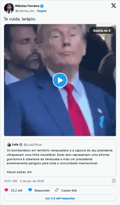 Já em outro momento, também no sábado, o liberal republicou um tweet feito por Lula, no qual o presidente se manifestou contra o ocorrido na Venezuela, com um vídeo de Trump gesticulando em tom de ameaça. “Te cuida, larápio”, escreveu o deputado.