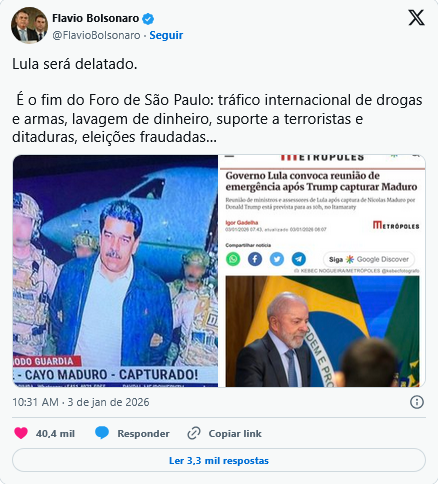 Flávio, por sua vez, publicou: “Lula será delatado. É o fim do Foro de São Paulo: tráfico internacional de drogas e armas, lavagem de dinheiro, suporte a terroristas e ditaduras, eleições fraudadas…“.